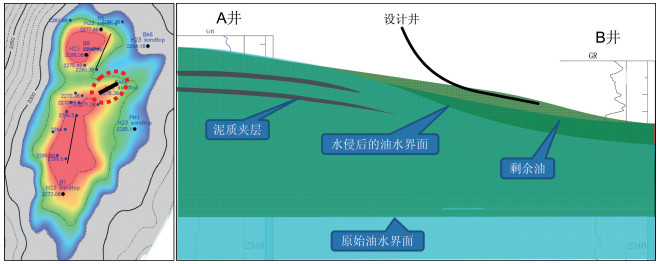 2.2 水平井轨迹设计根据C2油藏剩余油主控因素的研究成果,认为C2油藏东北部存在剩余油[4]。经过井型论证,最终采用水平井对该部位剩余油进行挖潜(图 4)。但水平井挖潜也存在两方面的风险:(1)据剩余油特征分析,认为该区域剩余油的油水界面可能是倾斜的,且A井的动用范围无法确定,故水平井如何避开水淹区钻遇剩余油存在非常大的风险;(2)在井网密度低的构造部位,砂体可能存在侧向尖灭,如何在不钻探领眼的前提下,保证水平井成功着窗存在较大的风险;(3)如何在水平段长度受限的前提下,保证油层钻遇率存在一定的风险。