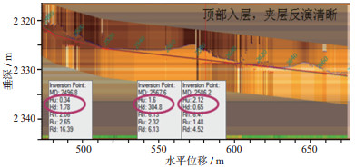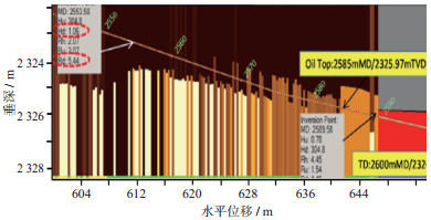 但是,当轨迹钻至目的层顶部的电阻率过渡带时,由于轨迹附近上下地层的电阻率差异变小,会导致预测界面存在一定的误差。如图 7中轨迹2 585 m处钻遇含油砂顶,随后电阻率界面立即出现在轨迹上方0.95 m处,说明此时预测的砂顶界面与实际砂顶存在0.95 m的误差。因此,针对上述的这种单界面情况,利用PeriScope随钻测井技术时需考虑上下电阻率差异大小带来的误差,避免出层的风险。对于薄油层而言,当轨迹钻遇油层时,电阻率反演剖面上会出现双界面,这种情况下即使出现误差,只需把轨迹控制在双界面中部就能消除误差影响,避免穿出油层。