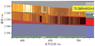 3 PeriScope效果评价通过两个分支的应用来看,PeriScope随钻测井技术能够较好地预测高阻砂顶界面。如图 7所示,斜深2 553.58 m时预测轨迹距砂顶1.06 m,即砂顶垂深为2 324.26 m,依据成像剖面计算地层倾角为3.15°,因此可以计算斜深2 585 m(钻遇含油砂顶)处垂深为2 326.04 m,实际钻遇砂顶深度为2 325.95 m,误差仅为0.09 m,预测精度非常高。这主要是由于2 585 m之前,轨迹处于泥岩中,下方含油砂体电阻率明显高于泥岩电阻率,故电阻率界面明显,预测精度高。