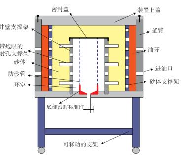 现有的实验装置采用笼统注入流体的方式,没有模拟近井地带径向流动的过程。本装置设计了砂体支撑架(图 3),建立釜臂与砂体之间的环空,实验过程中环空之间充满流体,以此来模拟近井地带径向流动的过程。