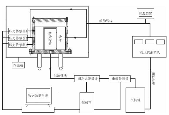 1.3 实验流程装置主体内安装待测防砂筛管,按照实验要求选择性充填砾石,开泵循环实验。通过数据采集系统对实验压力、流量、温度和出砂量数据进行实时采集,实验流程见图 5。