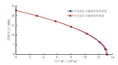 图 1 为不考虑应力敏感时线性渗流与非线性渗流条件下的气井IPR 曲线。经计算线性流动时气井无阻流量为13.32×104 m3/d,非线性流动时气井无阻流量为13.16×104 m3/d,非线性流动使无阻流量降低了1.2%。