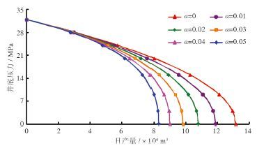图 2 为考虑应力敏感时不同应力敏感系数下的气井IPR曲线。经计算应力敏感系数分别为0.01、0.02、0.03、0.04、0.05 MPa-1 时, 气井无阻流量为不考虑应力敏感时无阻流量的90.3%、81.9%、74.8%、68.5%、63.0%,说明应力敏感对气井无阻流量影响比较明显。