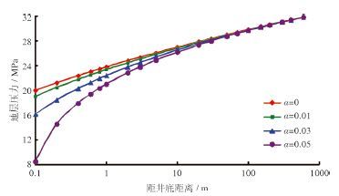| 图 4 应力敏感系数对地层压力分布的影响(pwf =15 MPa) |