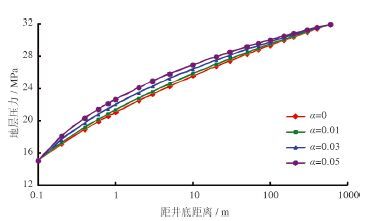 图 4 为气井以定井底流压15 MPa 生产时,不同应力敏感系数下的地层压力分布半对数曲线。可知,应力敏感系数越大,同一距井底距离处的地层压力越高。在井底附近1 m 的范围内,应力敏感系数分别为0.01、0.03、0.05 MPa-1 时,地层压力分别损失了35.4%、37.2%、45.0%,压力损失主要集中在井底附近较小的范围内。