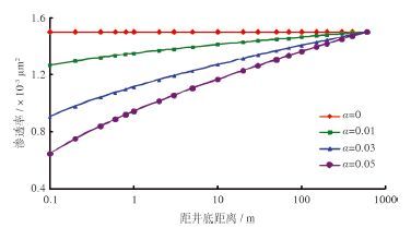 | 图 5 应力敏感系数对渗透率分布的影响(pwf =15 MPa) |
