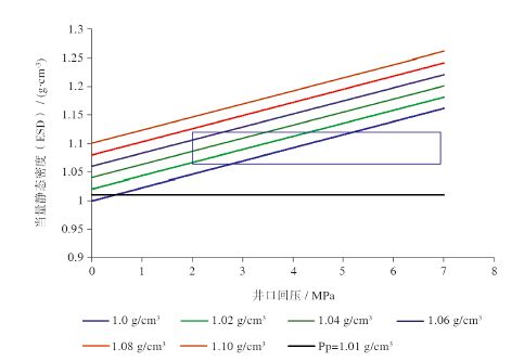 结合常规钻井钻井液密度确定方法和国外控压钻井钻井液密度确定方法,本文提出通过“等值线法”数值模拟合理泥浆密度。利用上述建立的精确水力学模型,考虑不同井口回压对ECD 的影响,模拟出井筒环空段精确ECD,作出不同井口回压和不同钻井液密度时的环空ECD 等值线图,结合地层压力剖面,给出合理ECD 区间即合理的操作窗口,如图 2、图 3 方框空间,通过“等值线法”对静止、循环状态下控压钻井段开始、中间、结束点分别数值模拟,利用模拟操作窗口确定最优钻井液密度和井口回压值。