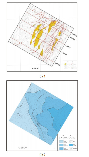 | 图 2 迎翠轩工区古新统埋深情况及三维测线位置(a),工区内古新统厚度分布(b) |