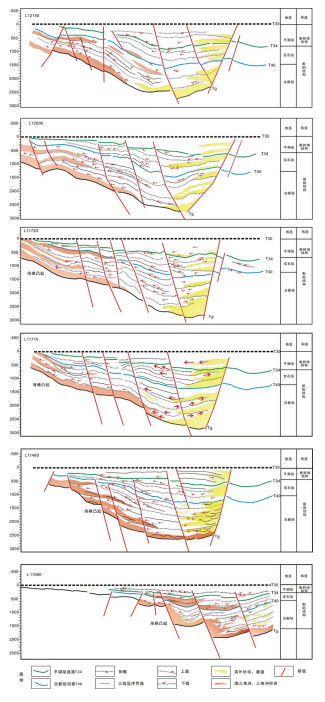 (1)海礁凸起控制了凸起前缘冲积扇裙;这一相区(图 6,L11050)地震相杂乱反射前积结构,反射弱、不连续,断裂控相,粗碎屑沉积体边界明显。