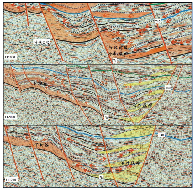 L11710,L11720测线表明海礁凸起影响已经趋向“缓坡”,同生断裂活动减弱,底部(Tg)粗碎屑分布很广,但中上古新统内低位域冲积扇活动明显减弱。