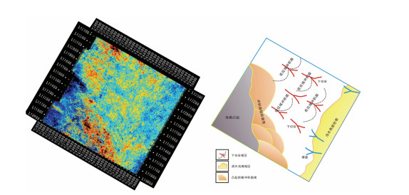 因此,从构造控相观点出发,结合T40~Tg层间均方根振幅资料,推测古新统沉积模式如图 7所示,图中突出三个相区:(1)海礁凸起控制作用形成凸起前缘冲积扇裙;(2)下切谷相区中同生断裂控制着下盘沿岸分布的低位域冲积扇;(3)盆内地垒结构控制了滨外浅滩富砂岩相带。