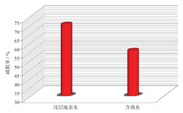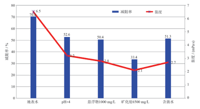 细菌也是影响减阻性能的因素之一。细菌繁殖过快产生大量沉淀和絮状物,造成储层伤害,同时会导致减阻性能发生很大改变。从图 5可以看出,含菌水(SRB 9 500个/mL、 TGB 3 500个/ mL、 FB 25×104个/mL)减阻率为50%,用浅层地表水配制的减阻水减阻率为65%,由于细菌存在导致减阻水减阻率下降。
