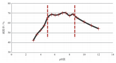 | (减阻剂质量分数0.08%,流速10 m/s,管径10 mm) 图 6 pH值对TM-02减阻性能影响 |