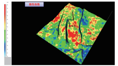 储层改造工作中岩石的脆性对压裂效果起着重要的作用,脆性越好,压裂造缝效果越好,因此脆性好的岩石发育区可作为工程“甜点”。岩石的脆性大小可用脆性指数来表示,而脆性指数可通过杨氏模量和泊松比属性归一化后计算得到,如图 10所示。脆性指数属性体可通过叠前反演得到的纵横波阻抗及密度计算得到,如图 11为预测出的K层脆性指数分布特征,从图中可以看出砂岩的脆性指数明显高于泥岩,脆性好的砂岩主要位于两井之间以及W2井的南部,局部区域脆性指数达到60%以上,砂岩脆性较好。