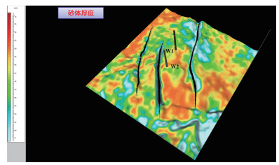通过叠前同步反演得到纵横波速度比Vp/Vs数据体,利用体雕刻技术可以求出砂体的时间厚度,然后运用地区的速度场进行时深转换可得到砂体的深度域厚度,如图 7所示,颜色越红表明砂体越厚,K层砂体在两井之间及W2井南部较为发育,最大预测厚度超过35 m,砂体预测厚度与钻井结果吻合较好。