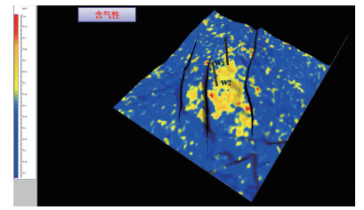 通过流体因子计算公式ρf=Zp2-C·Zs2,得到流体因子属性体,其中Zp为纵波阻抗,Zs为横波阻抗,C为比例因子,其取值范围依赖于所研究的储层,进而识别含气层,预测结果发现含气性预测结果与含气边界有较好的吻合度,在气水界面内具有明显的属性异常(如图 9所示黄色区域为含气区),含气性好的区域主要位于两口井之间以及W2井的南部,与钻井结果及地质认识吻合。