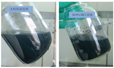 4 垢样分析 4.1 垢样溶解实验称取一定量的JX1-1-A1w垢样,垢样:酸液质量比1:25,分别使用无机垢清洗剂、10%HCl进行溶解实验,两种酸均能完全溶解垢样如图 3。