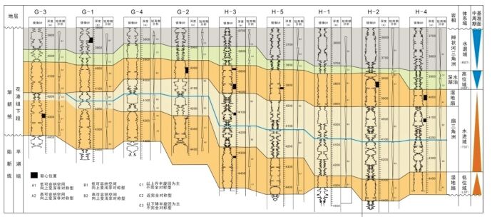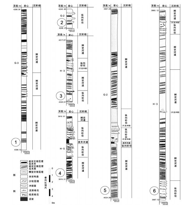 以四口钻井(G-2、G-3、H-3、H-5)的花港组下段6个回次取心为例(图 6),分别取自湿地扇巨厚砂体的上部(图 6中①,②,③),中部(图 6中④,⑤)以及下部(图 6中⑥)。