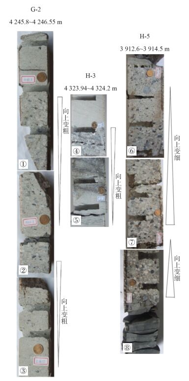 从取心资料看,花港组下段湿地扇巨厚砂体内部包含有辫状河道、纵向砂坝的复合过程。岩心中既有纵向砂坝是一个向上变粗的浅滩化过程,如G-2井4 245.8~4 246.55m(图 7中①,②,③);岩心中出现的片流砾石系浅水暴露标志,或出现在浅滩化的纵向砂坝中(图 7中④,⑤);或间夹在辫状河道块状砂体中标志着间隙性水流。也有河道过程形成向上变细的沉积序列,如H-5井3 912.6~3 914.5m(图 7中⑥,⑦,⑧)。无论哪种情况,都是湿地扇扇面沉积的特有现象。