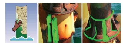 3 矿场应用渤海某油田注水管道现场海管立管腐蚀检测发现,外防腐层多处破损,海管立管段存在不同程度的腐蚀缺陷,并出现了腐蚀较严重的情况。管道已有多处达到高风险评级,为保证海上油气田的安全生产,急需对其修复补强。经过研究论证,最终采用四川德源提供的STRONGPIPE高强玻璃纤维复合材料系统对海管立管腐蚀缺陷段管进行了修复补强。