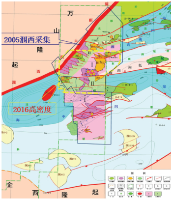 近期中石化上海海洋油气分公司先后在南海北部湾盆地北部坳陷涠西探区钻获多口工业油气流井,发现具有商业开采价值的涠洲油田。然而勘探开发面临着新的复杂地质问题,主要表现为:该构造断层纵横交错、储层横向变化大,给储层预测、井位部署带来了很大的困难。要解决复杂的地质问题以及进行精细油藏描述、油藏建模都需要高信噪比、高分辨率、高保真度的地震资料[1-2]。利用高密度三维地震采集技术,通过优化选择合理的采集、激发及接收参数,采集得到的原始地震资料品质得到较大提高[3-4],为涠洲油田的评价提供了可靠的数据基础