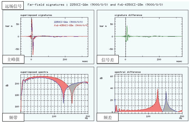 2.3 激发参数的分析图 3为本次采集所用4350CI震源(沉放5 m)与2005年采集所用2250CI震源(沉放6 m)的子波和频谱对比图,根据对比结果进行了数据统计(表 2)。从对比数据可以看出,4350CI震源各项指标均优于2250CI震源,在有效频带范围内,能量整体提高了约3 dB。