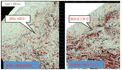 | 图 9 高密度资料和常规三维地震资料时间切片(1 400 ms)对比分析 |