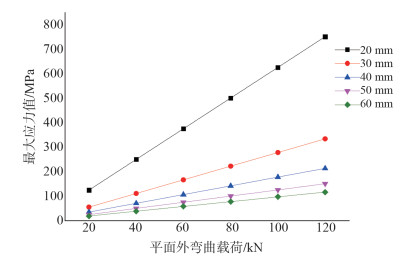 | 图 16 不同壁厚的弦杆的最大应力随不同外弯曲载荷变化图 |