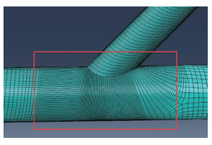 由于弦管和撑管的相贯区域曲率不连续,应力变化迅速,容易产生应力集中。因此在弦管和撑管的相贯区域采用局部种子为0.02,以获得该区域更规整更精细的网格(图 3、图 4),分别显示该Y型管节点整体网格和相贯区域的局部网格划分情况。采用ABAQUS单元库中的S4R标准单元,网格总体种子为0.1,模型总共有22 379个单元。