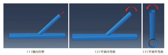 1.4 加载方式根据前人研究,Y型管节点在撑管上主要有三种受力方式[4]:轴向拉伸(axial loading)、平面内弯曲(in-plane bending,IPB)和平面外弯曲(outplane bending,OPB)(图 5)。