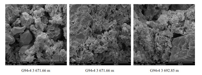 1 高尚堡深层储层特征分析 1.1 岩性微结构分析高尚堡深层储层填隙物微结构疏松,多为分散质点状,微结构杂基含量高,易于造成微粒运移损害(图 1)。