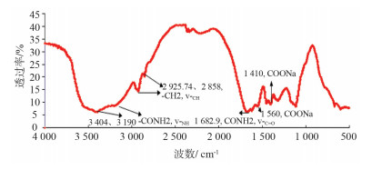 3 404 cm-1及3 190 cm-1处为-CO-NH2中NH键的伸缩振动,2 925 cm-1及2 858 cm-1附近的振动为聚合物主链-CH2的伸缩振动,而在1 682 cm-1处则出现羰基的伸缩振动吸收峰。这表明稠化剂为聚丙烯酰胺类高分子化合物(图 3)。