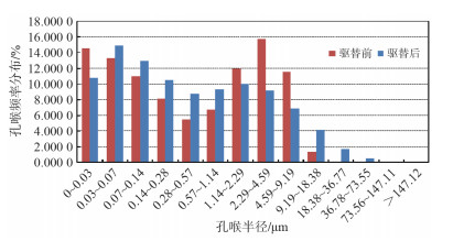 2.4 核磁共振分析结合压汞实验结果可知:高分子聚合物主要堵塞对渗透率贡献值较大的孔喉部分(孔喉半径为2 ~ 9 μm),造成大吼喉数量减少,小吼喉数量增加,并且驱替过程中开启了少量的多裂缝,增加了新的油气通道(图 4)。