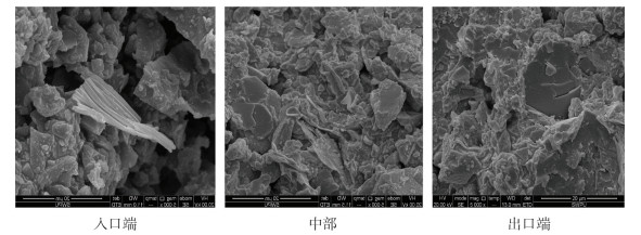 岩心的入口端有大量的残渣及残胶相互缠结呈片状吸附在黏土颗粒表面及堵塞在吼喉中,从而造成基块渗透率下降,岩心中部聚合物呈薄膜吸附在岩石颗粒表面,而出口端的岩石、黏土颗粒表面较干净、光滑(图 5、图 6)。