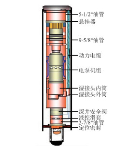 可以看出, 钢丝投捞电泵系统结构为油管内容纳潜油电泵机械结构, 湿接头外筒与大直径油管外的电缆相连接, 湿接头内筒连接在电泵机组最下部, 钢丝作业投送电泵机组到位时湿接头内筒和外筒插接相连, 地面的电力通过大直径油管外的电缆传输至电泵机组, 进而实现井液的传递。但井斜较大时钢丝作业无法下放到位, 因此该系统不适用于井斜较大的井。