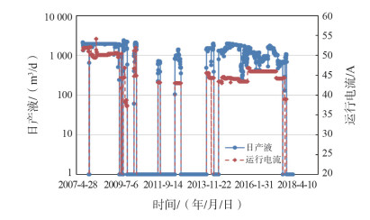 W1井为一口水源井, 产液量较大, 生产层位为Ng水层, 前期使用常规电泵进行生产, 经历3次修井检泵作业后, 2013年10月使用钢丝投捞电泵系统, 图 2为W1井生产曲线。