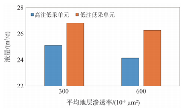 结果表明,当存在地层倾角时,注入水的驱替受重力的影响。对于高注低采单元,重力是动力;对于低注高采单元,重力是阻力。地层渗透率越大,重力作用带来的影响越大,因此高、低部位油井之间的合理液量差异越大。在同一平面内,注入水易沿渗透率高的部位突进,因此渗透率越高,对应的油井合理液量应该越小,从而对地下流场进行“控强扶弱”;同时由于低注高采单元的重力阻力起到一定削弱作用,所以不同渗透率的油井合理液量差异也相对较小。
