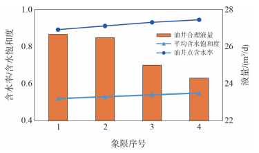 3.3 平均含水饱和度的影响假定调整前4个象限的平均含水饱和度分别为0.52、0.53、0.54、0.55,根据相对渗透率曲线求得对应注采单元的含水率并计算油井的合理液量(图 3)。