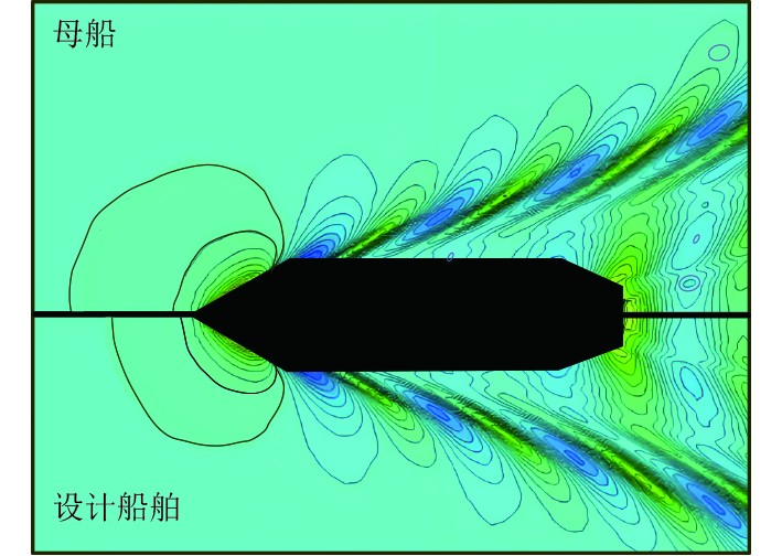 图 3 母船和设计船舶周围的波系分布图 Fig. 3 Wave system distribution around the mother ship and design ship |