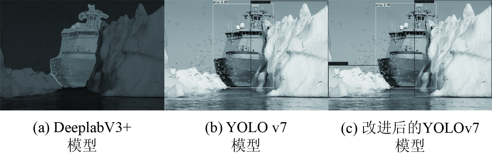 图6为3种模型在多障碍物遮挡条件下检测冰山效果对比。从检测结果可以看出,DeeplabV3+模型和改进后的YOLO v7模型在多障碍物遮挡情况下都可对冰山和船舶实现准确检测,YOLO v7原模型没有正确检测出遮挡部分的冰山。