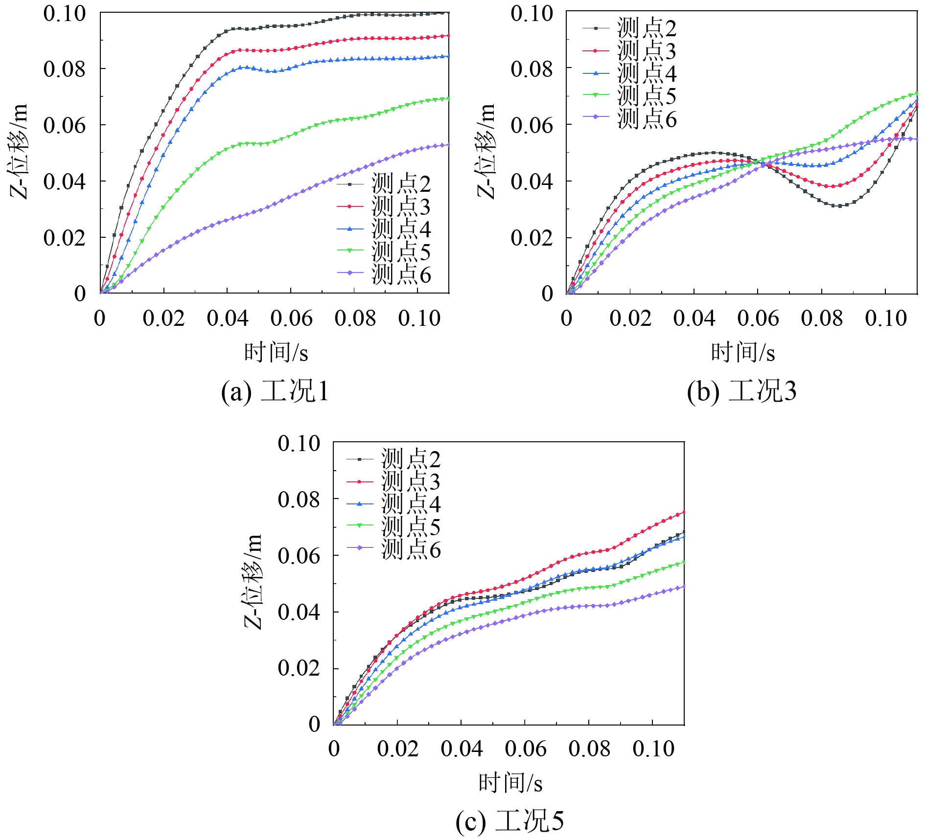 爆距增加气泡膨胀体积越来越接近理论值,无量纲参数接近于1时气泡膨胀、收缩、溃灭的过程是完整的,如图9所示。对比于图8爆距增加环向裂纹的产生时间也随之推迟。工况3的测点位移如图10(b),因气泡完整收缩使层冰垂向位移向负方向移动,测点5和测点6距离冰板中心较远所受影响不明显,测点2、测点3、测点4位移较大,因此测点之间产生交点,当无量纲爆距