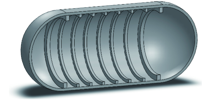本文选取圆柱形耐压壳体,两端采用半球式封头,内部采用8根环形肋骨进行结构加强,并且与两端半球封头连接的2个肋骨进行加强,中间6个肋骨型号相同且等距分布,采用结构型式如图1所示。