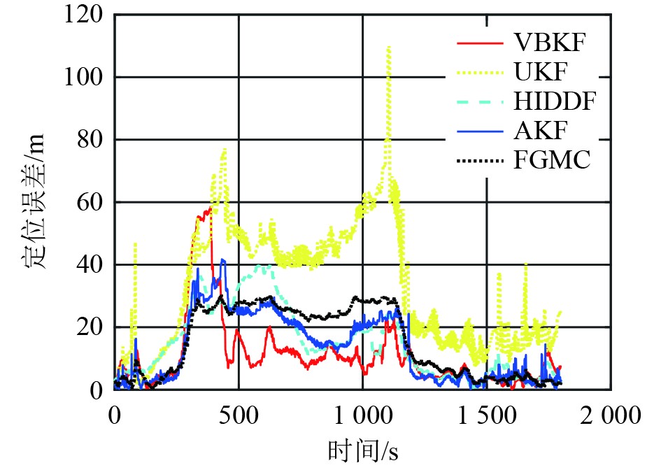通过对实验数据的离线处理,本文的VBKF自适应协同定位算法与传统的UKF、HIDDF、FGMC协同定位算法的误差对比如图3所示。