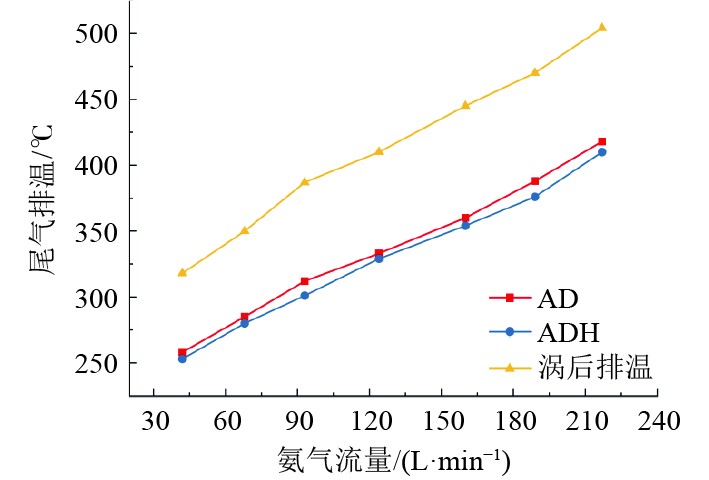 在发动机运行过程中,氨重整器相关的运行参数如图4和图5所示,分别详细展示了在不同氨气流量条件下,AD模式和ADH模式下的尾气排温变化情况和ADH模式下氨气换热后温度变化。从图中可以看出,随着氨气流量的逐渐增加,由于负荷的增大,尾气排温也呈现出逐渐上升的趋势。与此同时,氨气经过换热处理后的温度也呈现出相应的上升现象。在发动机运行的不同氨气流量条件下,ADH模式相较于AD模式,尾气排放温度普遍有所降低。这种现象的原因在于尾气与氨气进行换热过程中消耗了一部分热量,导致尾气温度下降。无论是否进行氨气换热,尾气排温相比于涡后排温均有显著的降低,这主要是由于重整器自身的温升以及与散热损失所导致的。