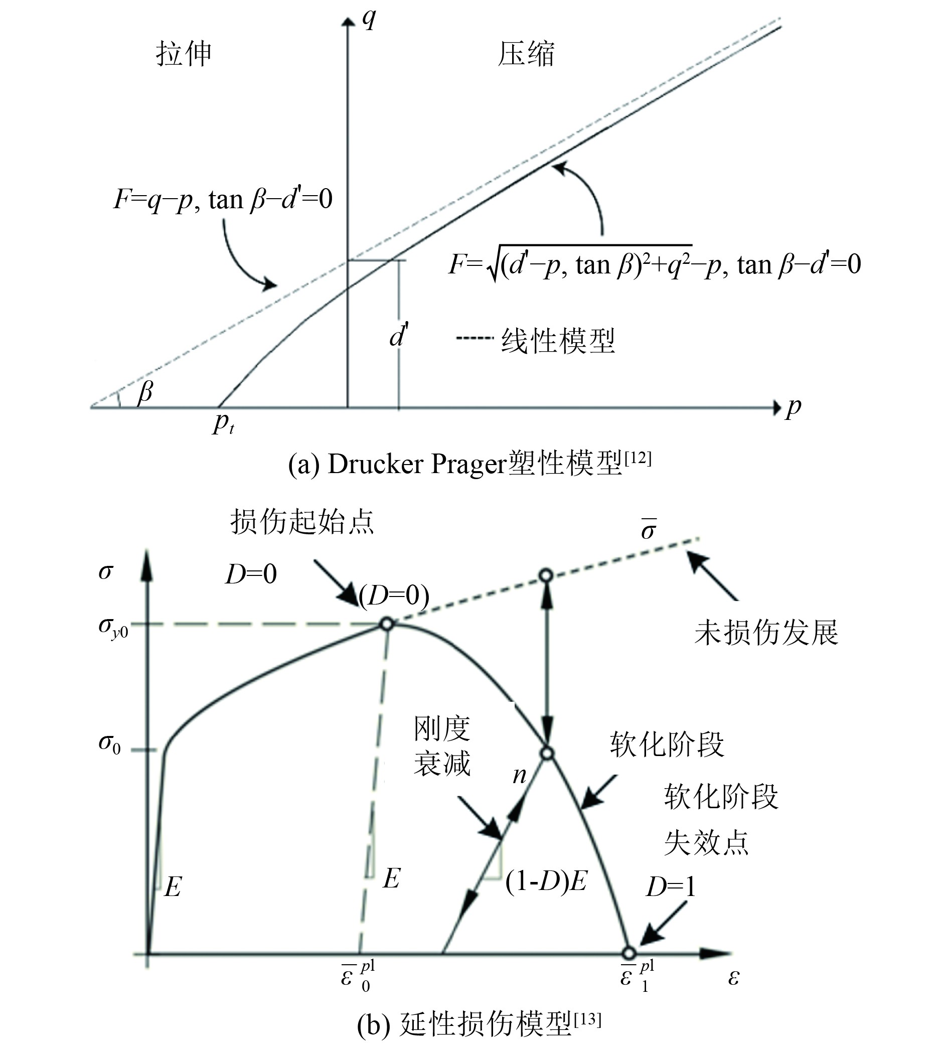 Drucker Prager塑性模型是在Mises屈服准则中引入了静水压力的影响。该准则应用于屈服时,通常会有3种屈服面形式,分别为线性形式和双曲线形式等,如图3(a)所示,本文选取简单的线性形式,该形式在偏平面上提供了一个可以不是圆形的屈服面,以匹配三轴拉伸和压缩的不同屈服值,在偏平面上相关的非弹性流动,以及分开的膨胀和摩擦角。图中,