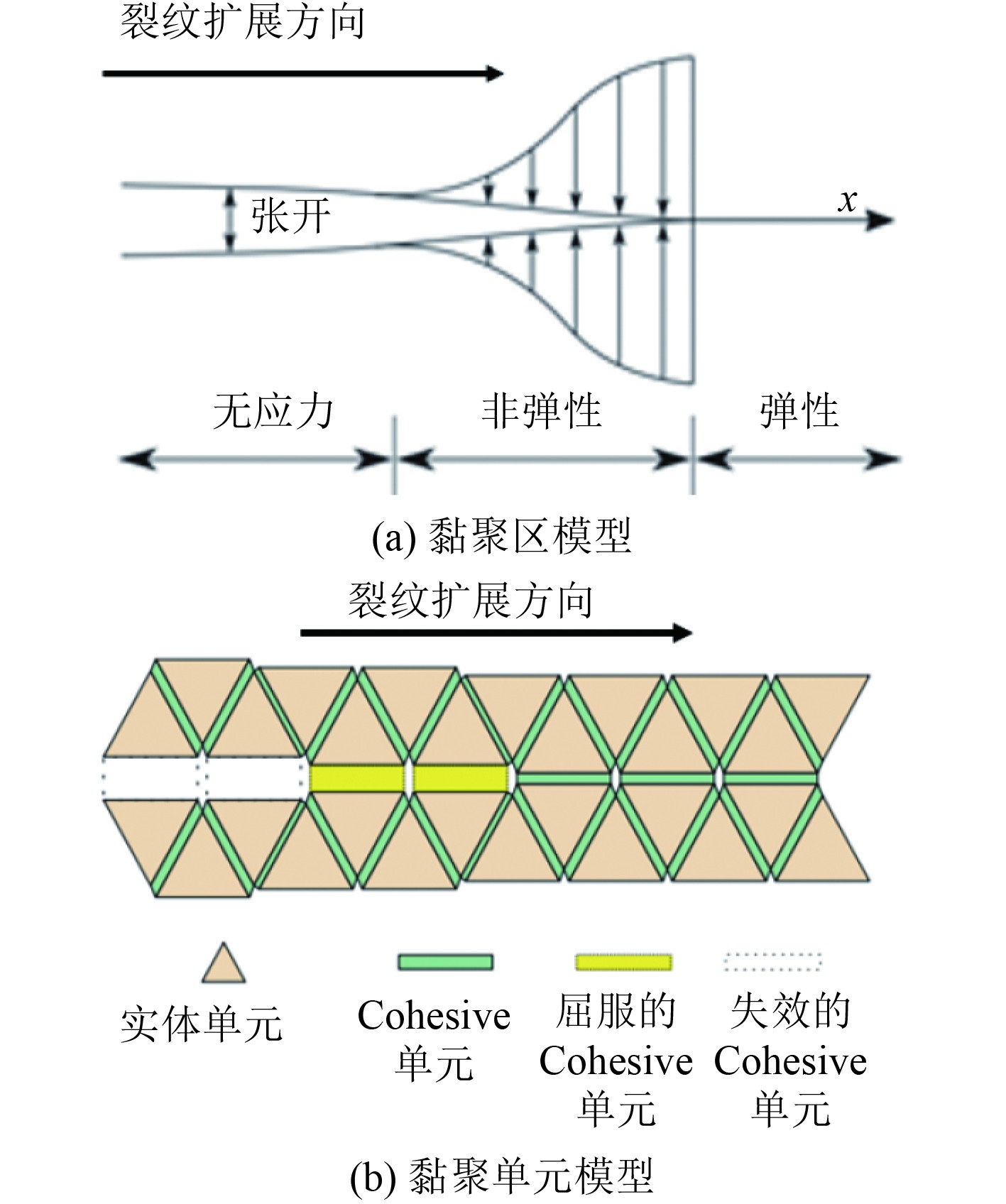 FDEM方法也可称为黏聚单元模型,见图4(a),该模型起源于黏聚区模型,见图4(b),是处理裂纹问题的一种简化方式,被广泛应用于陶瓷、玻璃和岩石等脆性材料的裂纹扩展、碎裂模拟。采用FDEM模拟裂纹扩展时,需要在实体单元的公共面上嵌入Cohesive单元,在已知裂纹扩展路径时,可以按照裂纹路径嵌入Cohesive单元。