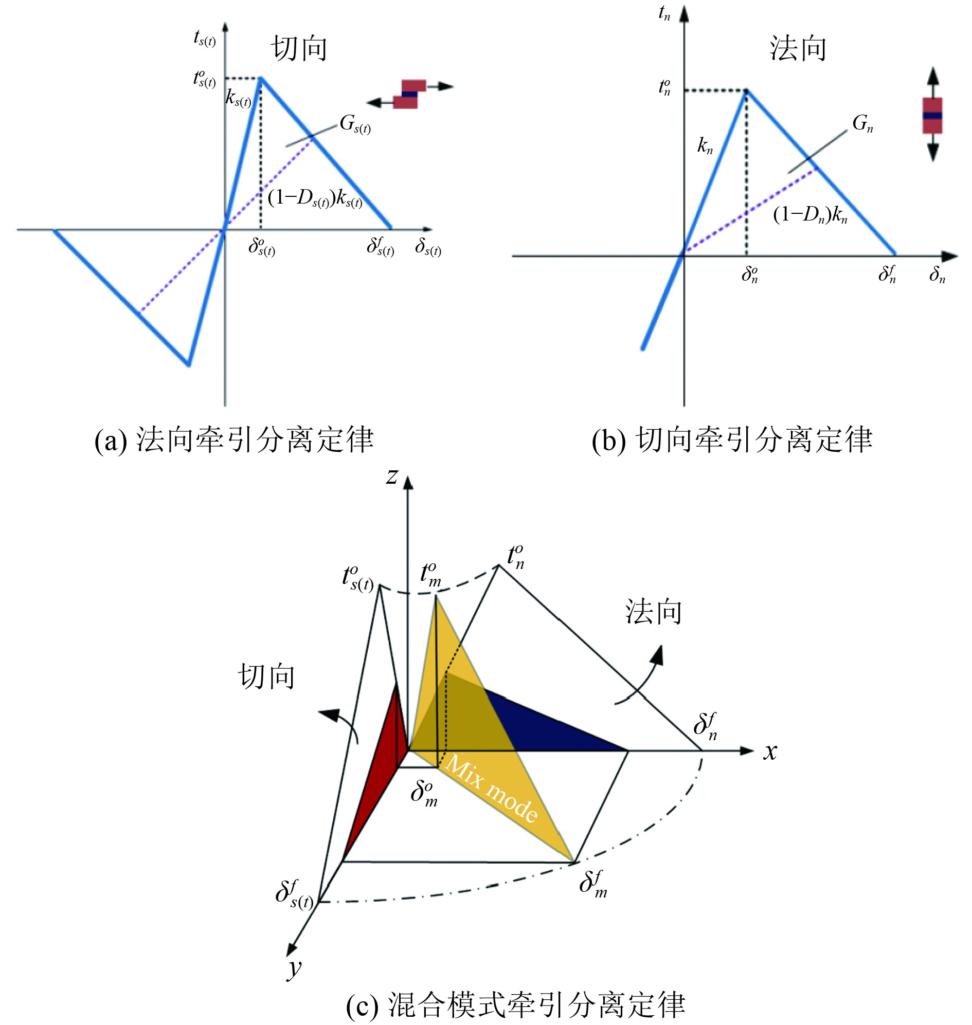 FDEM方法常被应用于冰与结构的相互作用模拟中,可以较准确模拟冰从连续到破碎的过程。Cohesive单元本构关系由牵引分离定律表示,牵引分离定律由弹性阶段、损伤起始判据、损伤发展阶段和失效判据4个部分组成。损伤发展阶段可简单分为混合损伤演化模式(各受力方向损伤相互影响、耦合)和模态独立损伤演化模式(各受力方向不受其他方向影响,损伤独立发展),复杂裂纹扩展模拟时需要考虑各方向的耦合作用。独立和混合模式下黏聚单元牵引力与分离位移之间的关系如图5所示。图中,