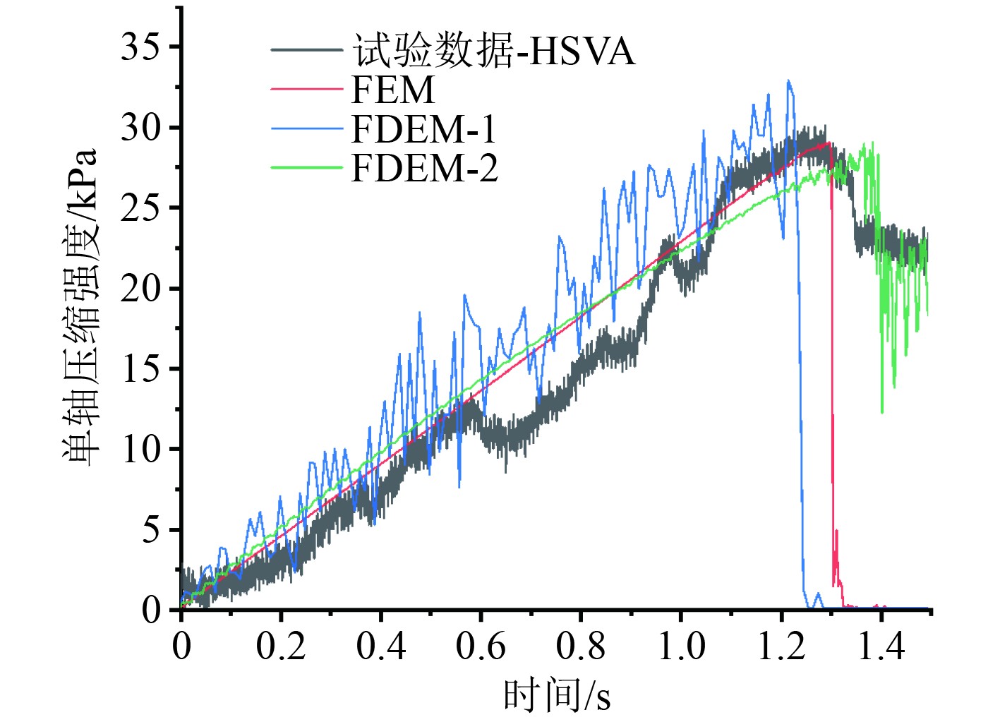 图 8 基于FEM和FDEM的柱状冰单轴压缩模拟结果 Fig. 8 Simulation results of uniaxial compression for columnar model ice based on FEM and FDEM |