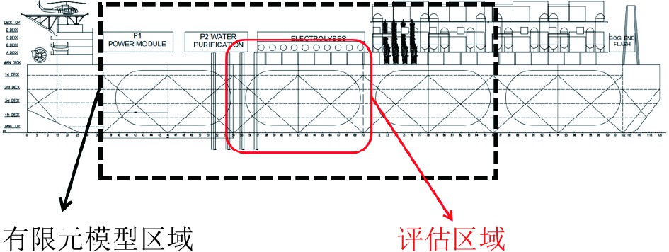 1 浮式制氢平台碰撞有限元模型构建 1.1 碰撞模型简介本文涉及的浮式制氢储氢运输一体化平台与撞击船舶的主尺度参数如表1所示。为了深入分析平台舷侧遭受撞击后对液氢储罐舱室的影响,选择平台中段液氢储罐放置区域作为撞击位置。具体的撞击评估区域如图1所示。