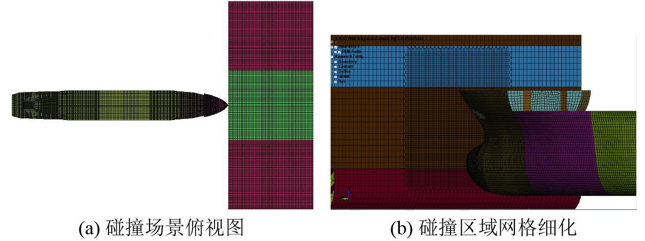 在船舶碰撞过程中,接触表面之间的相互作用十分复杂。因此,选择适当的接触算法对于精确模拟船舶碰撞过程至关重要。本文采用 Contact-Automatic-Surface-to-Surface 接触算法,该算法将撞击船与平台之间的碰撞定义为从接触点到平台主接触面之间的相互作用。这种算法的优势在于能够在碰撞仿真过程中自动搜索和更新接触边界,从而确保计算的精度和稳定性。在本文构建的船舶碰撞有限元模型中,所有潜在的接触表面均被定义为碰撞后可能发生接触的区域。接触面之间的摩擦系数取0.3。